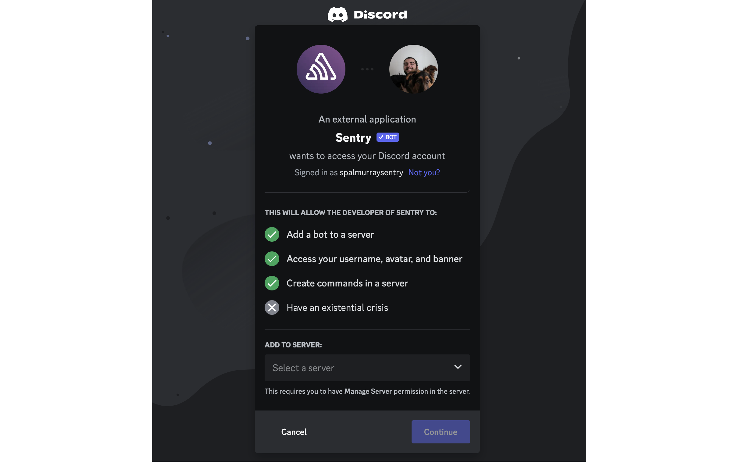 Use the dropdown menu to select the Discord server you'd like to add Sentry to and click "Continue".