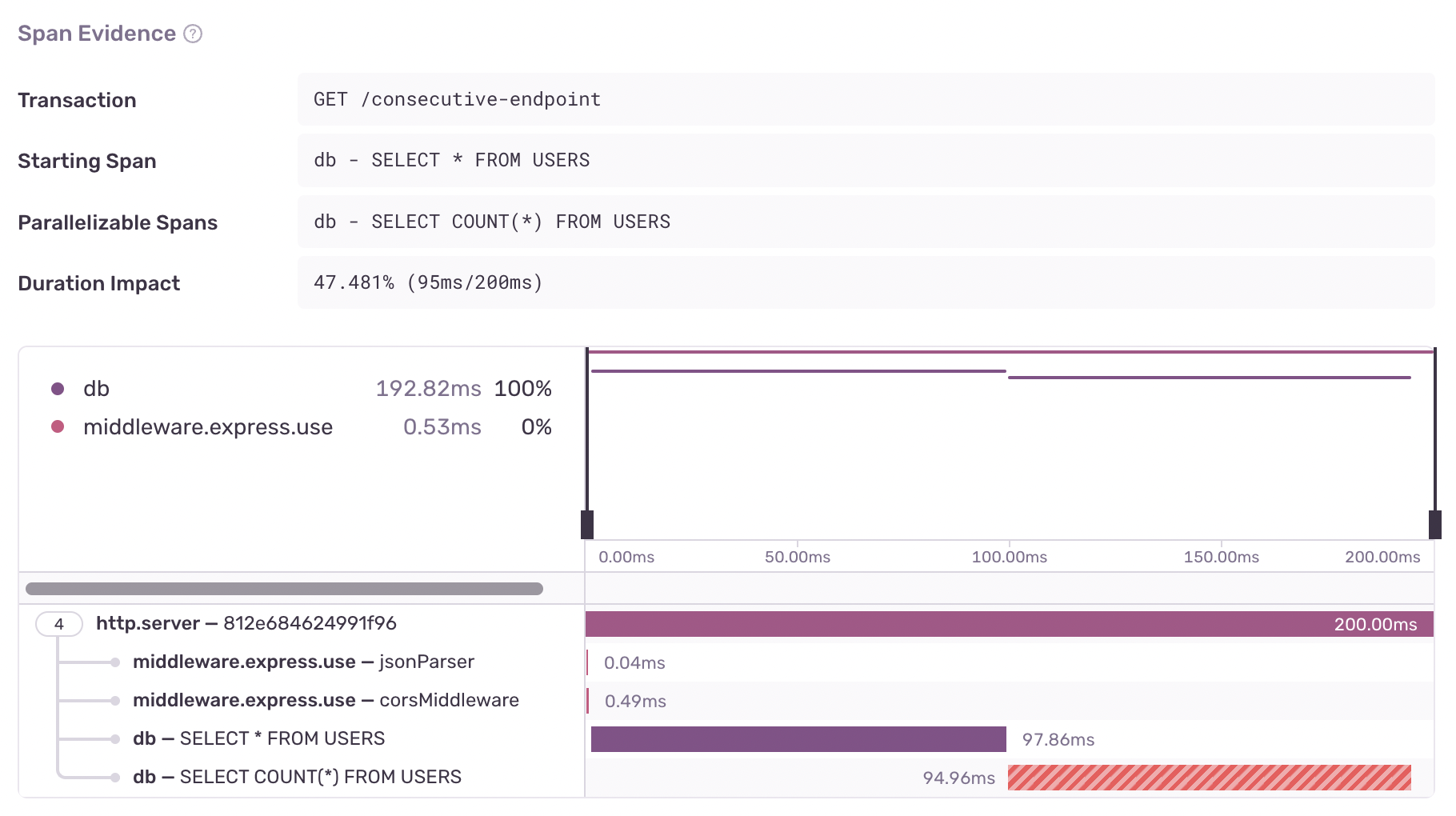 You can identify a Consecutive DB Queries problem by four main aspects in the "Span Evidence" section: