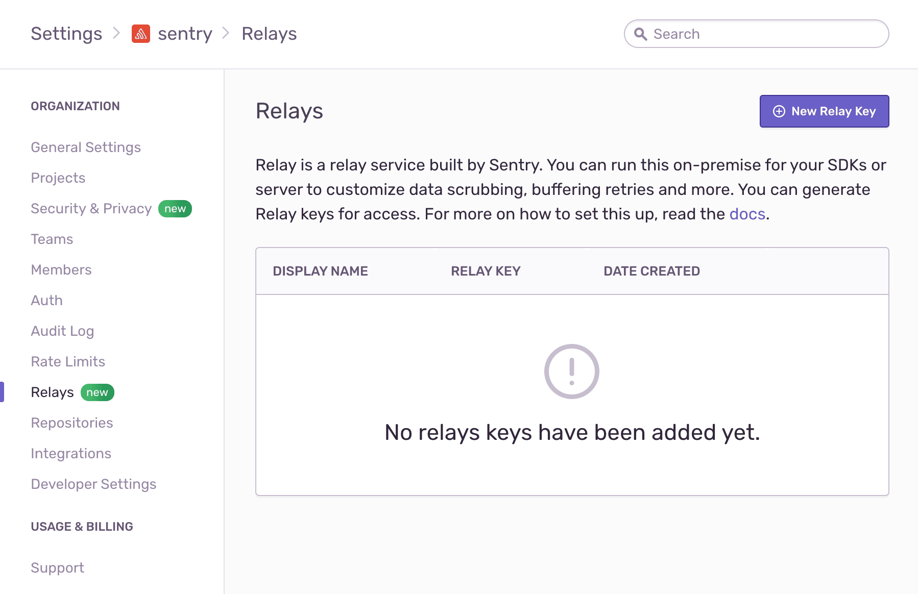 Click on Settings in the main navigation for Sentry, then select Relays.